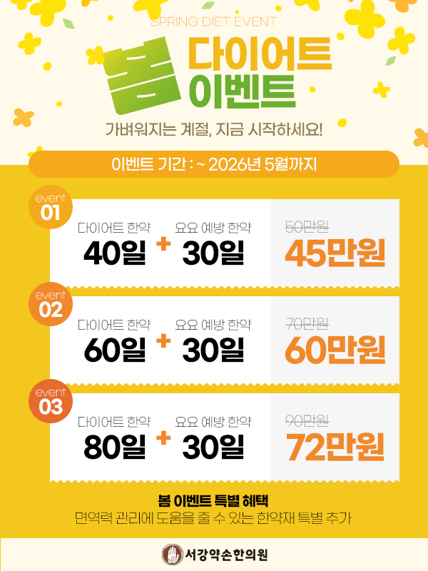 서강다이어트는 내과 전문의와 한의학 박사가 검증한 안전한 한방 처방을 통해 요요 현상 없이 건강하게 체중을 감량하는 체계적인 시스템을 제공합니다. 신진대사를 활성화하여 별도의 운동 없이도 지방 분해와 독소 배출을 원활하게 돕는 효율적인 방식을 채택하고 있습니다. 무리하게 굶지 않는 1:1 맞춤형 체질 개선을 통해 프로그램 종료 후에도 감량된 체중을 스트레스 없이 유지할 수 있도록 도와드립니다.
